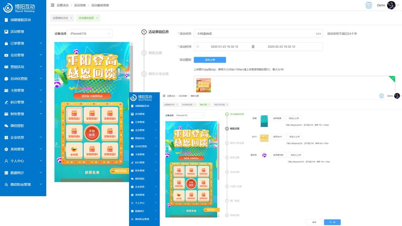 微信活動(dòng),聚攬人氣:利用博陽(yáng)會(huì )員管理系統中,H5營(yíng)銷(xiāo)模板,快速啟動(dòng)微信H5活動(dòng),例如節日抽獎、溯源海報等